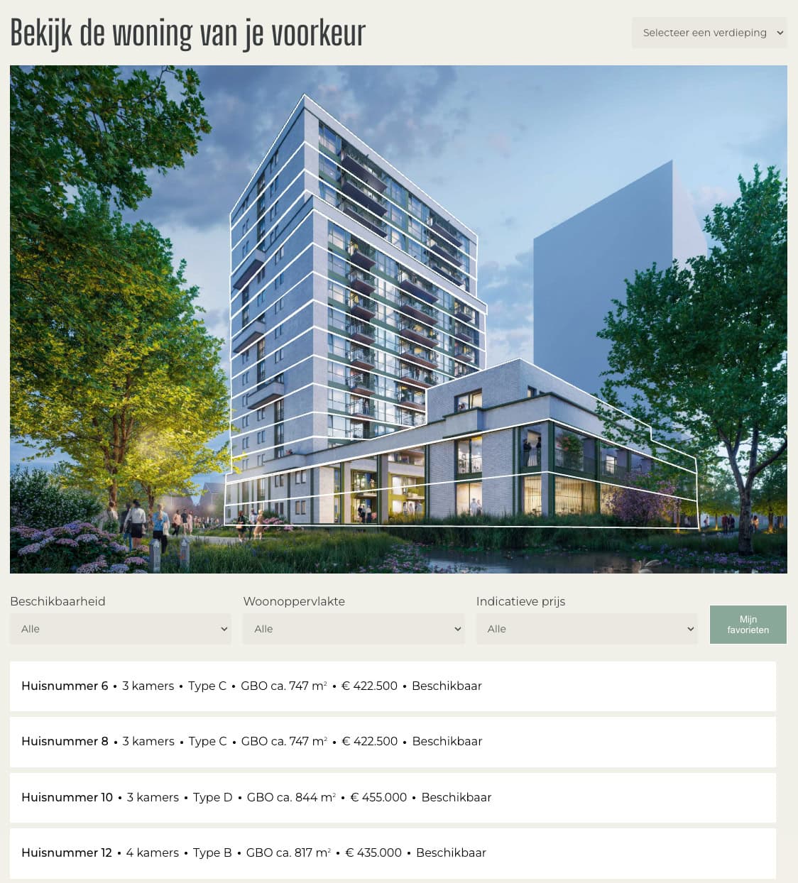Je kunt ook direct een verdieping selecteren om de daarop gesitueerde woningen te bekijken. Heeft een woning jouw voorkeur? Klik op het hartje en voeg deze dan eenvoudig toe aan je favorieten. Met het filter ‘mijn favorieten’ kun je later snel alleen jouw favoriete woningen bekijken.