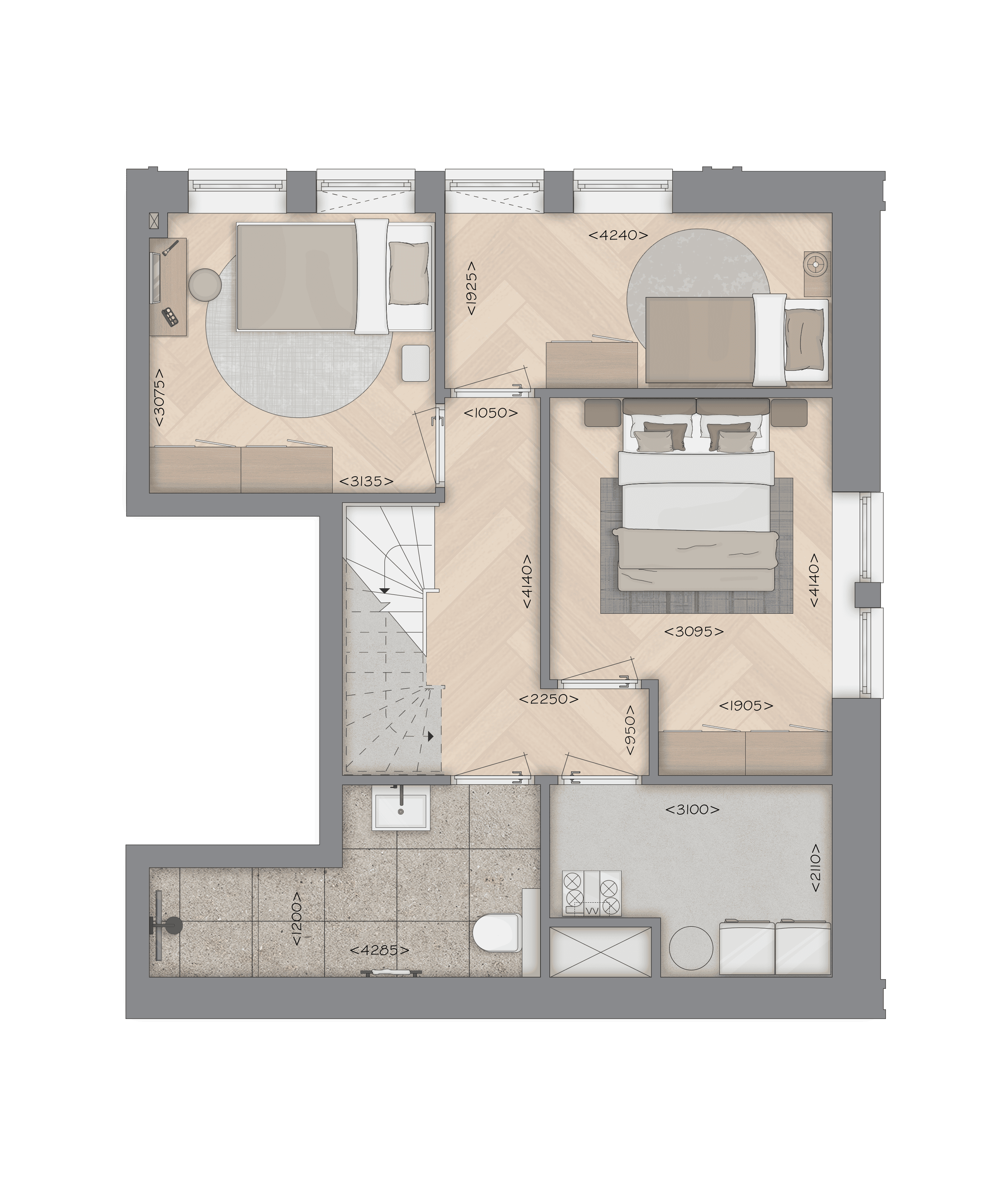Hier woon je royaal en flexibel. De 4-kamerappartementen bieden drie slaapkamers en een ruime living met open (hoek)keuken. Afhankelijk van het type heb je een balkon (zuidwest voor middag- en avondzon of noordoost voor de frisse ochtend), twee Franse balkons bij slaapkamers, of op de begane grond zelfs een stadstuin. Hoekappartementen profiteren van raamwerk aan twee zijden; hogere verdiepingen (11e–14e) verrassen met panoramisch uitzicht. Sommige typen hebben een inloopkast bij de hoofdslaapkamer en/of een extra toilet in de badkamer. Overal geldt: moderne afwerking, praktische indeling en keuze tussen de levendigheid lager of licht en zicht hoger.
