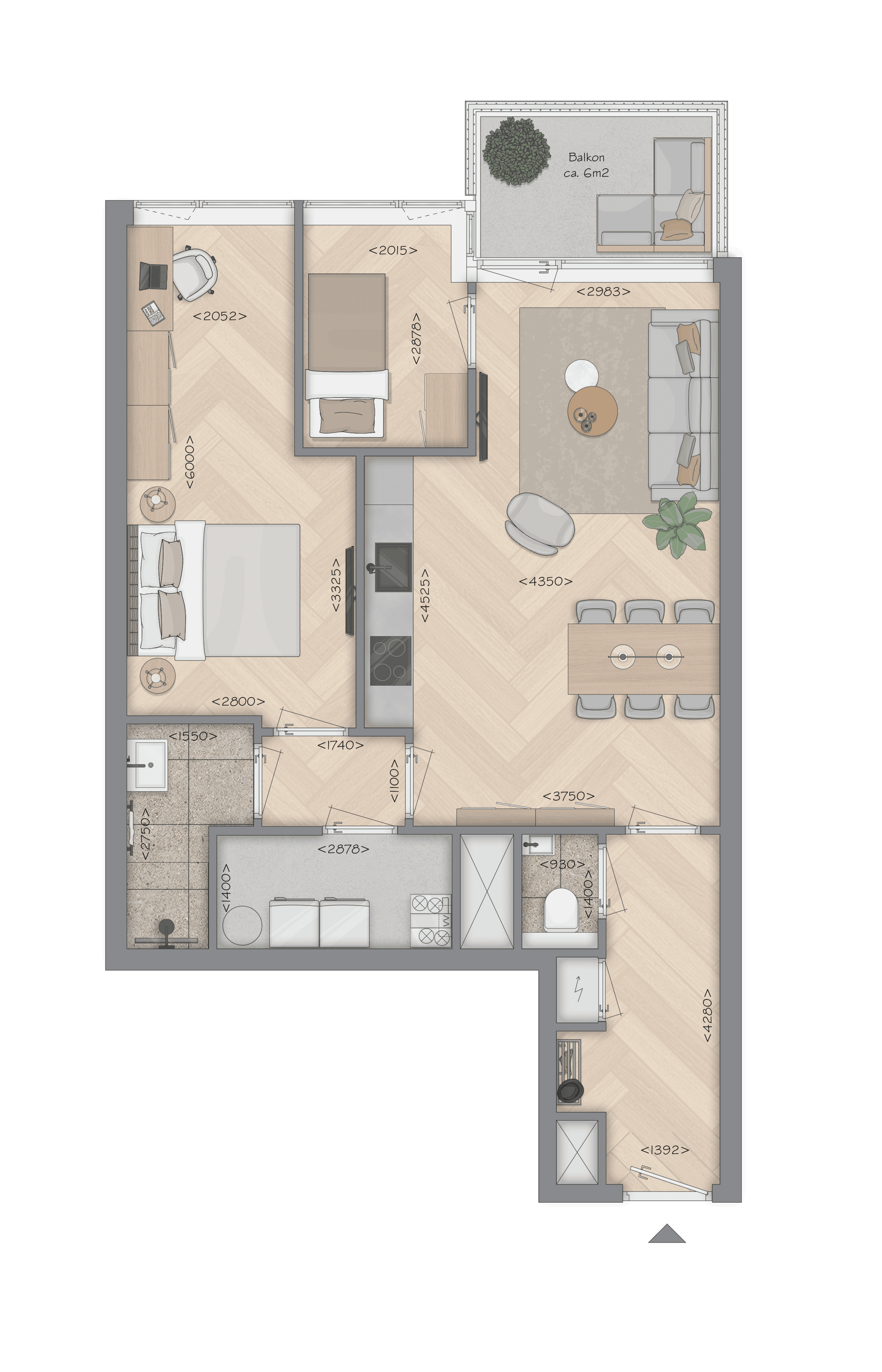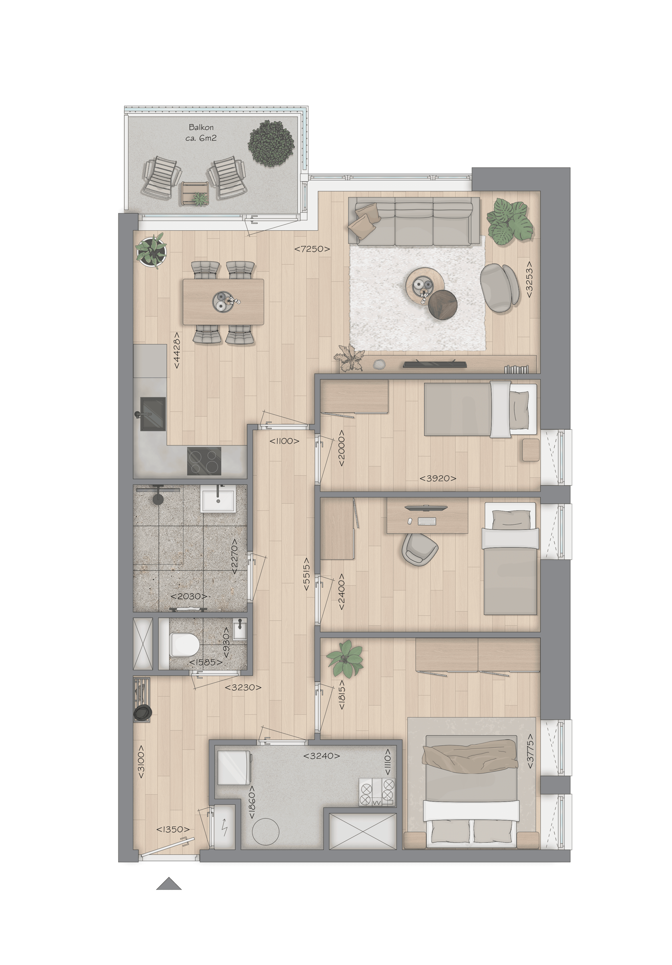 Comfortabel wonen met twee slaapkamers en een lichte living: de 3-kamerappartementen bieden circa 66–85 m² woonoppervlak, een open keuken en vaak een balkon op het zuidwesten—heerlijk voor de middag- en avondzon. De woonkamers variëren van 33 tot 42 m²; kies je voor een etage dichter bij de levendigheid of juist hogerop voor extra licht en uitzicht. Sommige typen kijken uit op de binnentuin, andere zijn hoekappartementen met ramen aan twee kanten (beperkt beschikbaar).